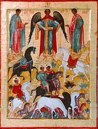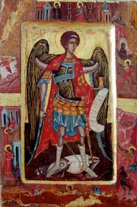 Archangel Michael is an Archistrategos (Commander in Chief), head of the Holy warrior-host of Angels guarding the law of God. The revelation of St. John the Divine narrates about the celestial battle of Archangel Michael with the dragon. As a result the dragon, also called devil or Satan, was precipitated back to Earth.