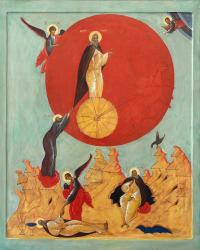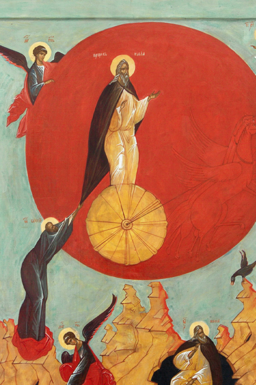 Elijah (Hebrew: Yahweh is my God) was a prophet in the Old Testament. The prophet was taken up alive to Heaven on a fiery chariot as a reward for his ascetic lifestyle and his fiery zeal for the Glory of God. Elijah’s disciple and witness of his fiery ascent, the prophet Elisei (Elisha), is depicted below on the hills, receiving together with Elijah’s fallen-down mantle a gift of prophetic spirit.