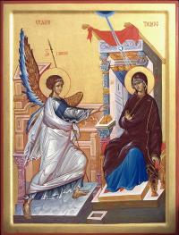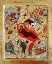 This feast day icon is instinct with the feeling of joy and exaltation. In the centre of the icon there is the Mother of God and the Child and the shaft of the Star of Bethlehem descends upon them. A bull and a donkey are warming up the Divine Child with their breath. On the right there are the shepherds who have received the Good News about Christmas of the Saviour of this world. On the right there are the three Wise Men “following the star” with the gifts to for the everlasting Father.