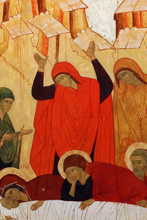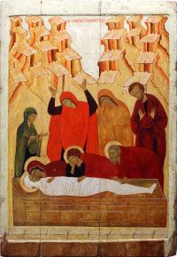 This icon describes the evangelic scene of the interment of the crucified Jesus Christ. On the icon you can see pall with the body of Jesus, the Mother of God falling down to it, St. John the Evangelist, secret apostles of Christ Joseph and Nicodemus, myrrh-bearing women.